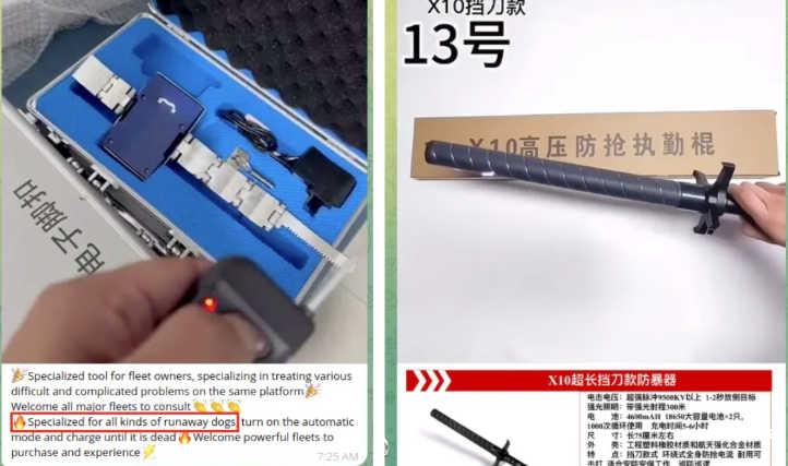 还有各种其他支持诈骗的产品和服务,包括被诈骗基地运营者用来监禁和折磨工人的设备。我们的研究人员发现了催泪瓦斯、电棍和电子镣铐的广告,电子镣铐可以在佩戴者离开预定区域时发出电击。这些商家提到“防止逃跑者”和控制“逃跑的狗”。在诈骗基地工作的人通常被称为“狗”或“狗推子”。